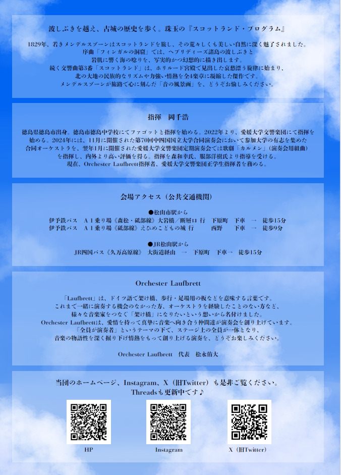2025年より愛媛県で活動を開始した企画オーケストラ「Orchester Laufbrett」の第1回演奏会。たくさんの音楽家を繋ぎ、情熱と愛情を持って音楽を深掘る団体です。